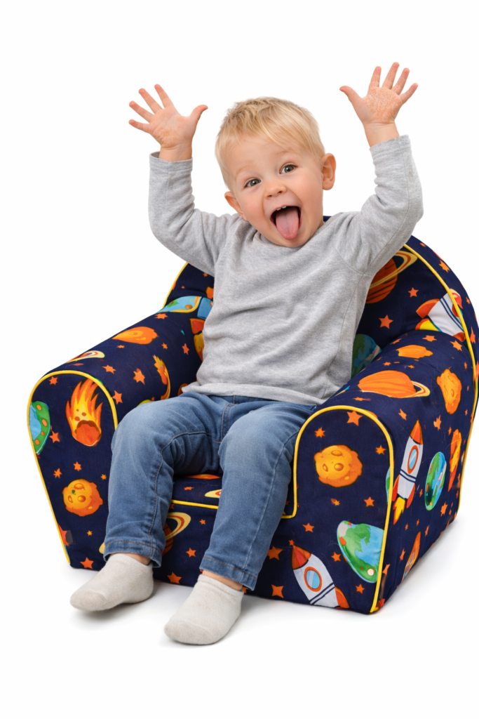 Śliczny i wygodny fotel dziecięcy z pianki jest super dekoracją pokoju malucha. Ponad to posiada on również praktyczne zastosowanie, idealnie nadaje się do zabawy i wypoczynku. Jest bardzo mięciutki i wygodny, dlatego dzieci go uwielbiają. Jego ciekawy i kolorowy wzór zachęca maluchy do zabawy. Świetnie nadaje się do czytania lub oglądania książeczek i bajek. Granatowy fotelik kosmos z pewnością sprawdzi się jako prezent dla chłopca jak i dziewczynki, dzięki temu że posiada uniwersalny kolor i wzór.