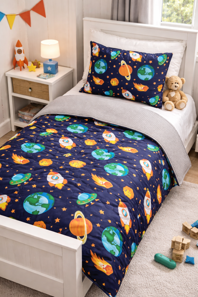Śliczny komplet pościeli wafel planety – kocyk plus poduszka. Idealny na drzemki w przedszkolu i w domu. Zestaw jest przyjemny w dotyku i antyalergiczny. Jego dodatkowym atutem jest piękny wzór kosmos. Na zdjęciu zestaw uszyty z waflem w kolorze szarym. Z pewnością spodoba się wszystkim dzieciom, które fascynuje kosmos. Zasypianie w takiej pościeli to czysta przyjemność.