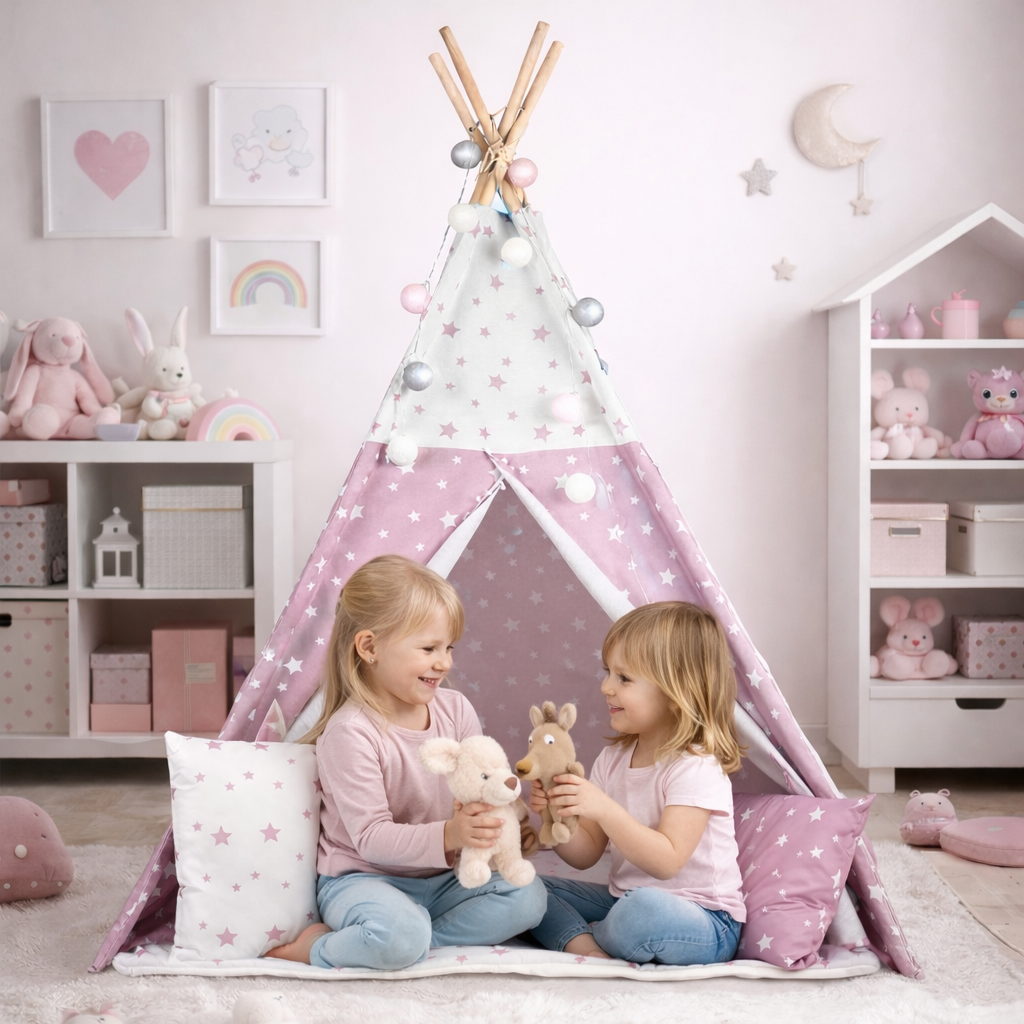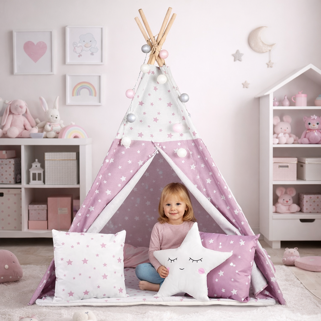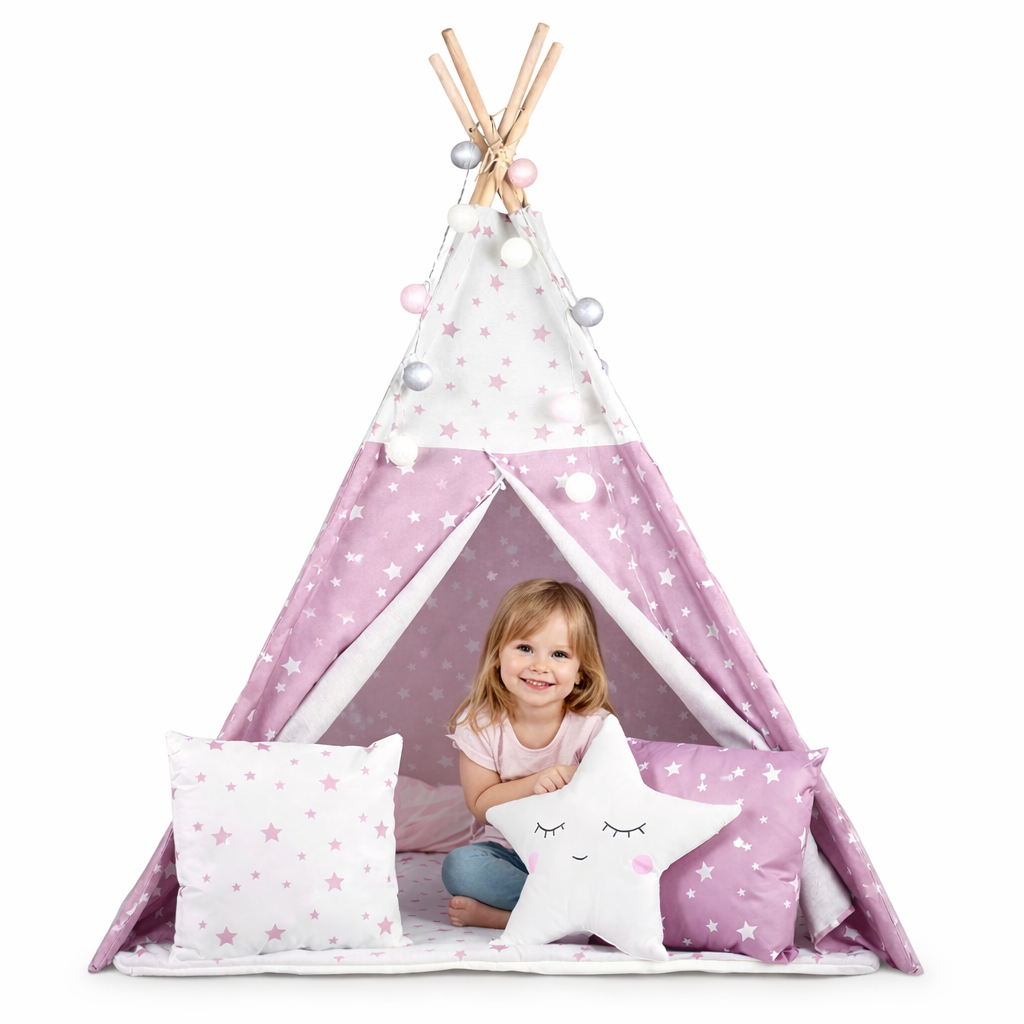 Namiot tipi to z pewnością jeden z największych hitów, wśród produktów dla dzieci ostatnich lat. Bez wątpienia jest idealnie przytulnym miejscem do zabawy dla każdego malucha. Uwielbiają go zarówno dziewczynki jak i chłopcy. Dzieci kochają różnego rodzaju kryjówki, budują bazy z koców i kołder lub okupują miejsce pod stołem robiąc swoje domki i bazy. Dziecięca wyobraźnia nie zna bowiem granic. Dla maluchów, które uwielbiają takie zabawy, mamy idealne rozwiązanie. Piękny i stylowy namiot dla dzieci różowy w gwiazdki, który łączy w sobie funkcjonalność i piękny wygląd. Jest śliczną ozdobą pokoju, a jednocześnie idealną i wymarzoną kryjówką dziecka. Wykonany został z przyjemnych i naturalnych materiałów co z pewnością czyni go idealnym i bezpiecznym miejscem do zabawy.