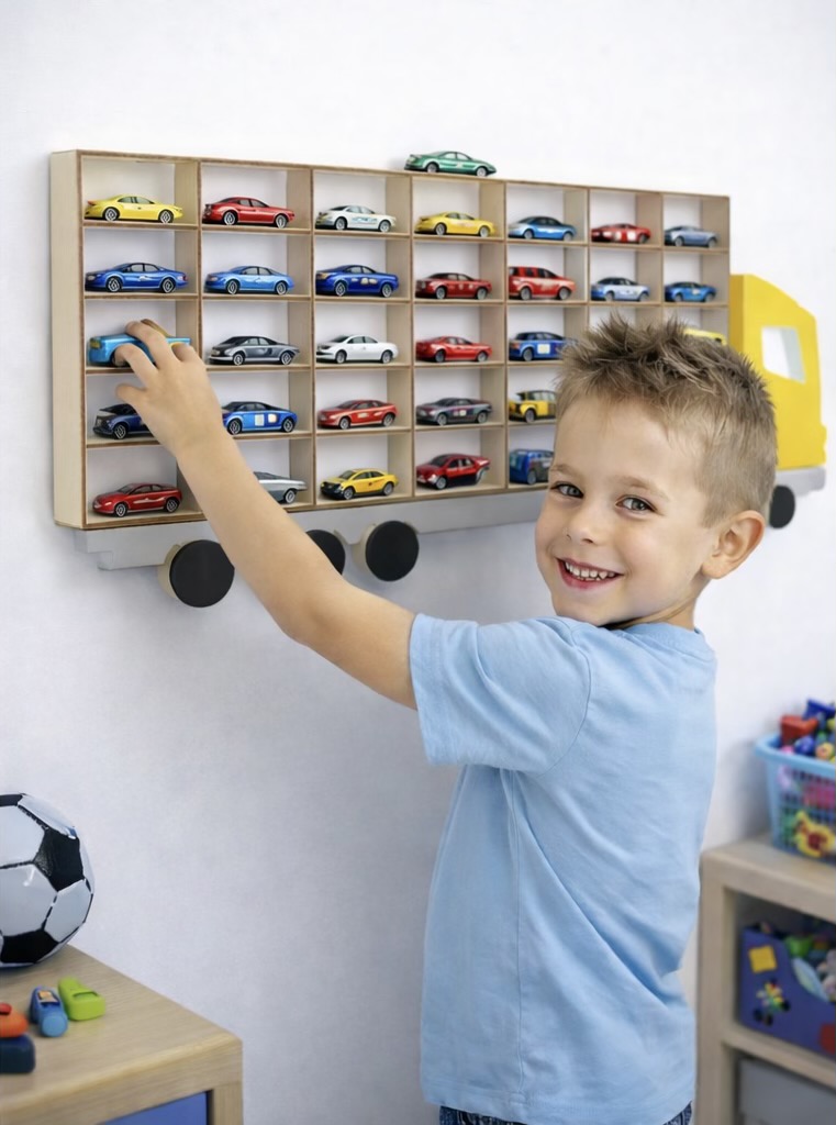 Ulubioną zabawą małych chłopców bez wątpienia jest zabawa samochodzikami. W pokoju dziecka można znaleźć ich dość sporo, zwłaszcza gdy nasza pociecha kolekcjonuje autka. Półka na resoraki w kształcie ciężarówki pozwoli na ekspozycję modeli samochodów Twojego syna. Jednocześnie pomoże posprzątać i uporządkować zabawki. W rezultacie utrzymasz porządek w pokoju malucha. Ta półka to również piękna dekoracja pokoju ponieważ ma ciekawy i oryginalny kształt. Każdy mały chłopiec z pewnością będzie nią zachwycony.