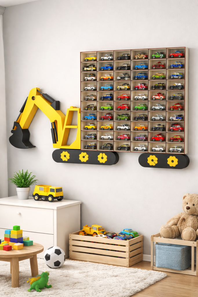 Ulubioną zabawą małych chłopców często jest zabawa samochodzikami. W pokoju dziecka można znaleźć ich dość sporo, zwłaszcza gdy nasza pociecha kolekcjonuje autka. Półka na resoraki koparka pozwoli na ekspozycję modeli samochodów Twojego syna oraz pomoże posegregować i uporządkować zabawki. Dzięki niej w łatwy sposób utrzymasz porządek w pokoju malucha. Dodatkowo to piękna dekoracja pokoju. Każdy mały chłopiec będzie nią zachwycony. Jeśli nie masz pomysłu na prezent dla Twojego Małego Budowniczego półka na autka będzie bez wątpienia strzałem w dziesiątkę.