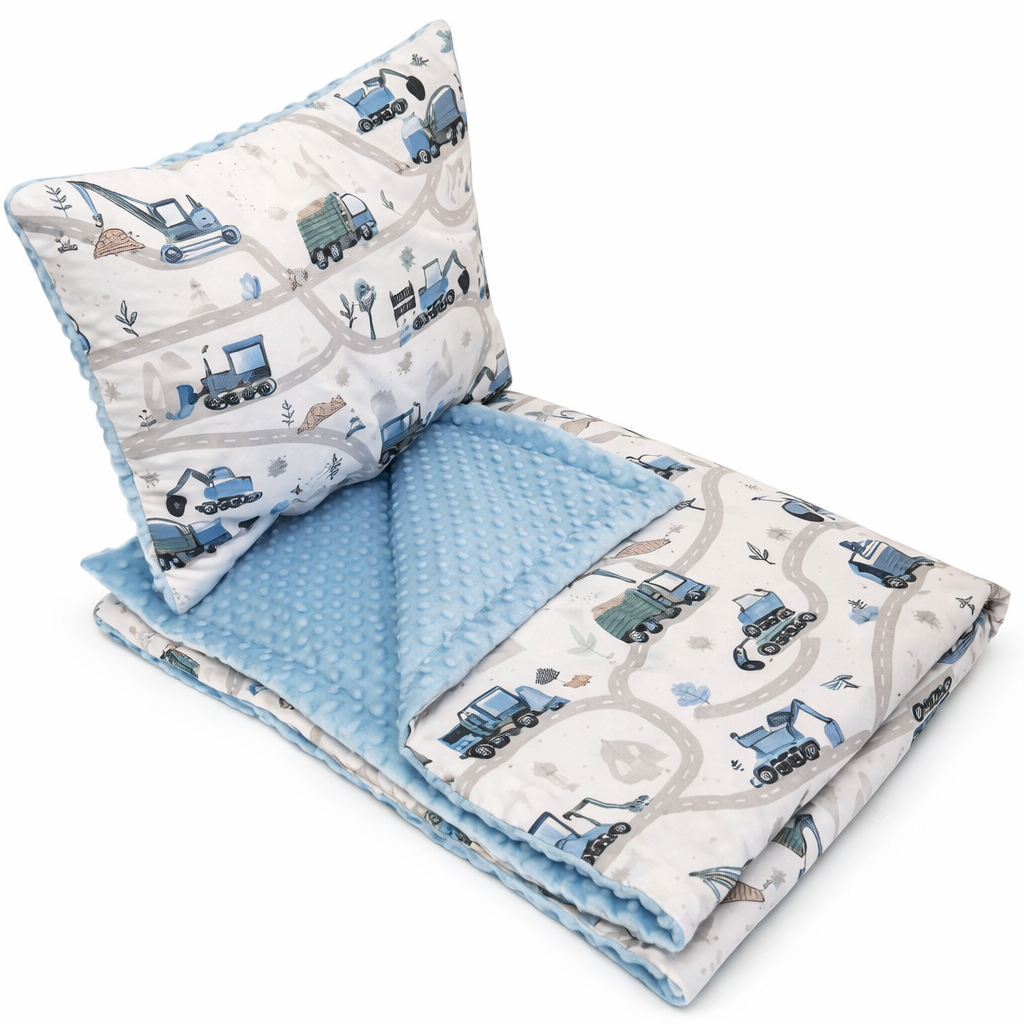 Śliczna pościel do przedszkola dla chłopca – kocyk plus poduszka. Idealny na drzemki w przedszkolu i w domu. Bawełna plus mięciutkie minky premium. Zestaw jest przyjemny w dotyku i antyalergiczny. Jego dodatkowym atutem jest piękny wzór pojazdy+ minky kolor do wyboru. Zasypianie w takiej pościeli to niewątpliwie czysta przyjemność.