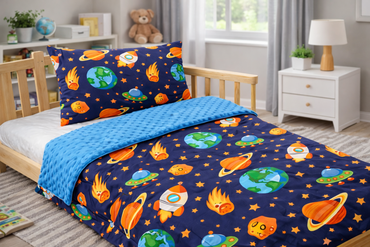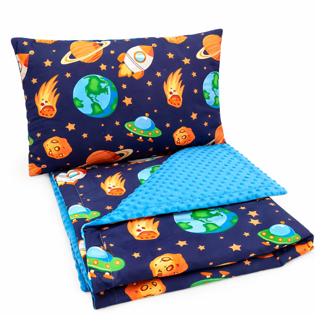 Śliczna pościel do przedszkola kosmos – kocyk plus poduszka. Idealna na drzemki w przedszkolu i w domu. Bawełna plus mięciutkie minky premium. Zestaw jest przyjemny w dotyku i antyalergiczny. Jego dodatkowym atutem jest piękny wzór kosmos + niebieskie minky. Z pewnością spodoba się wszystkim dzieciom, które fascynuje kosmos. Zasypianie w takiej pościeli to czysta przyjemność.