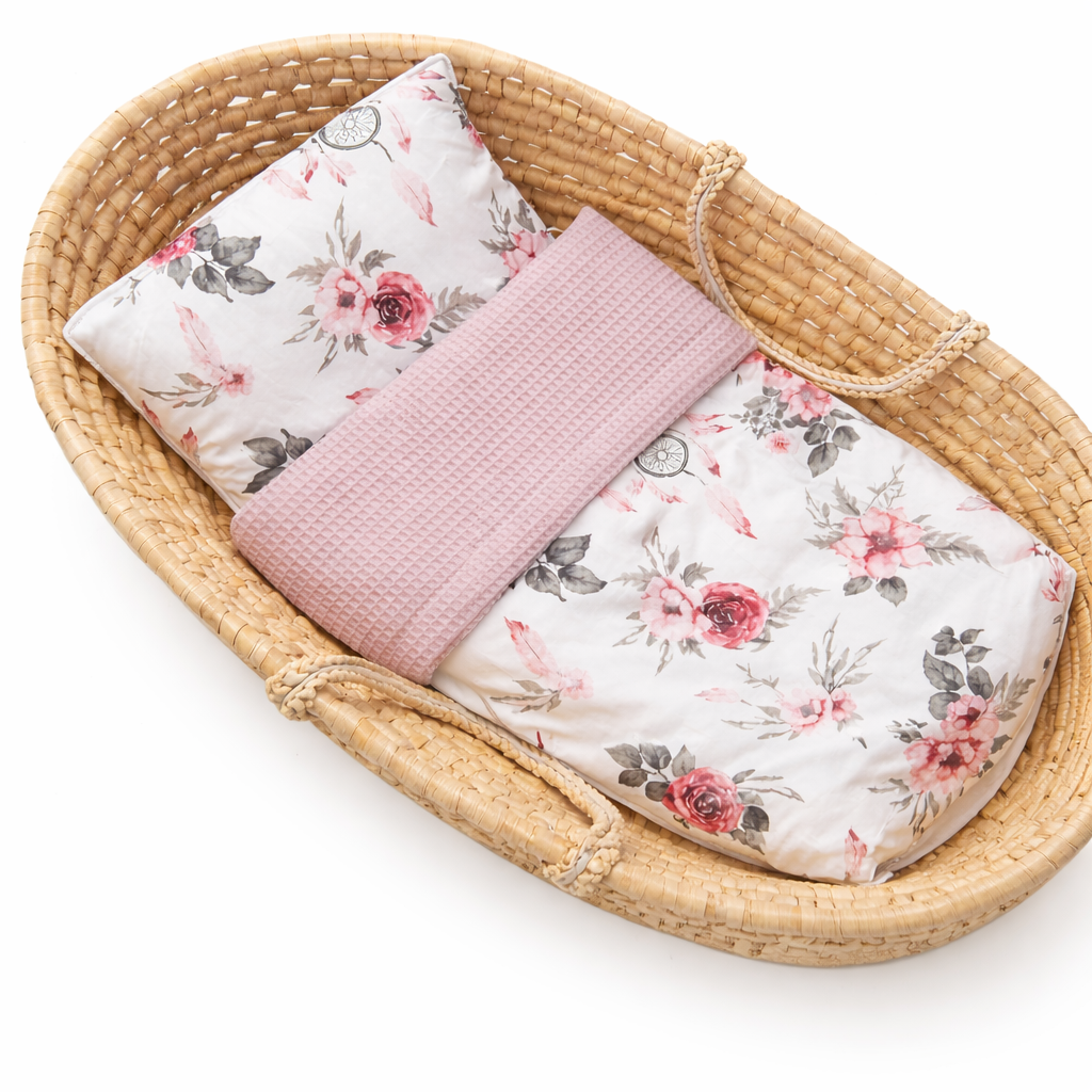 Śliczna pościel wafel do wózka łapacze snów, bez wątpienia świetnie sprawdzi się również w koszu Mojżesza. Komplet jest delikatny i uroczy, stworzony dla malutkich księżniczek. Kocyk o wymiarach 75cmx50cm z jednej strony uszyto z niezwykle miękkiej i przyjemnej w dotyku bawełny, z drugiej z grubszego wafelka. Do wyboru mają Państwo poduszkę prostokątną: 25cmx35cm lub poduszkę w kształcie misia: 37cmx30cm. Podobnie jak kocyk poduszka z jednej strony uszyta jest z bawełny a z drugiej z bawełny wafel. W kocyk oraz w poduszkę wszyto antyalergiczną włókninę silikonową nadającą im lekkości, jednocześnie zapewniając przyjemne ciepło.