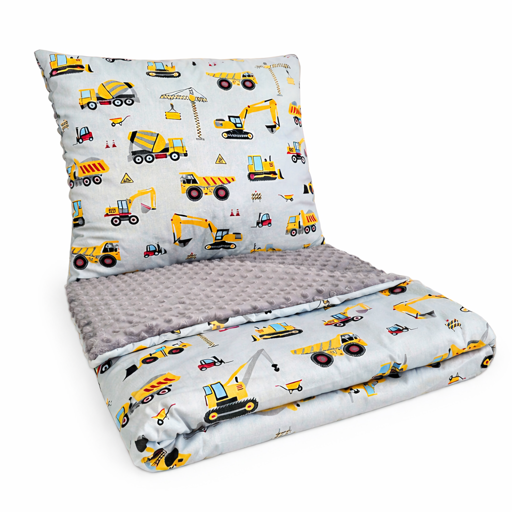 Śliczna pościel z wypełnieniem dla dzieci – kocyk plus poduszka. Idealny na drzemki w przedszkolu i w domu. Bawełna plus mięciutkie minky premium. Zestaw jest przyjemny w dotyku i antyalergiczny. Jego dodatkowym atutem jest piękny wzór koparki+ szare minky. Z pewnością spodoba się wszystkim małym chłopcom. Zasypianie w takiej pościeli to czysta przyjemność.