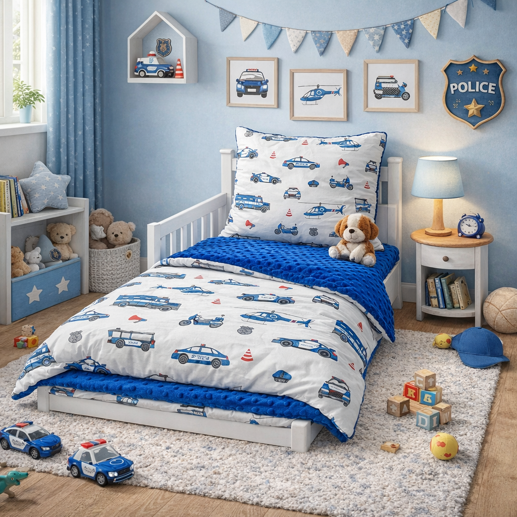Śliczna pościel z wypełnieniem policja – kocyk plus poduszka. Idealny na drzemki w przedszkolu i w domu. Bawełna plus mięciutkie minky premium. Zestaw jest przyjemny w dotyku i antyalergiczny. Jego dodatkowym atutem jest piękny wzór policja + granatowe minky. Z pewnością spodoba się wszystkim dzieciom, które fascynuje praca policji. Zasypianie w takiej pościeli to czysta przyjemność.