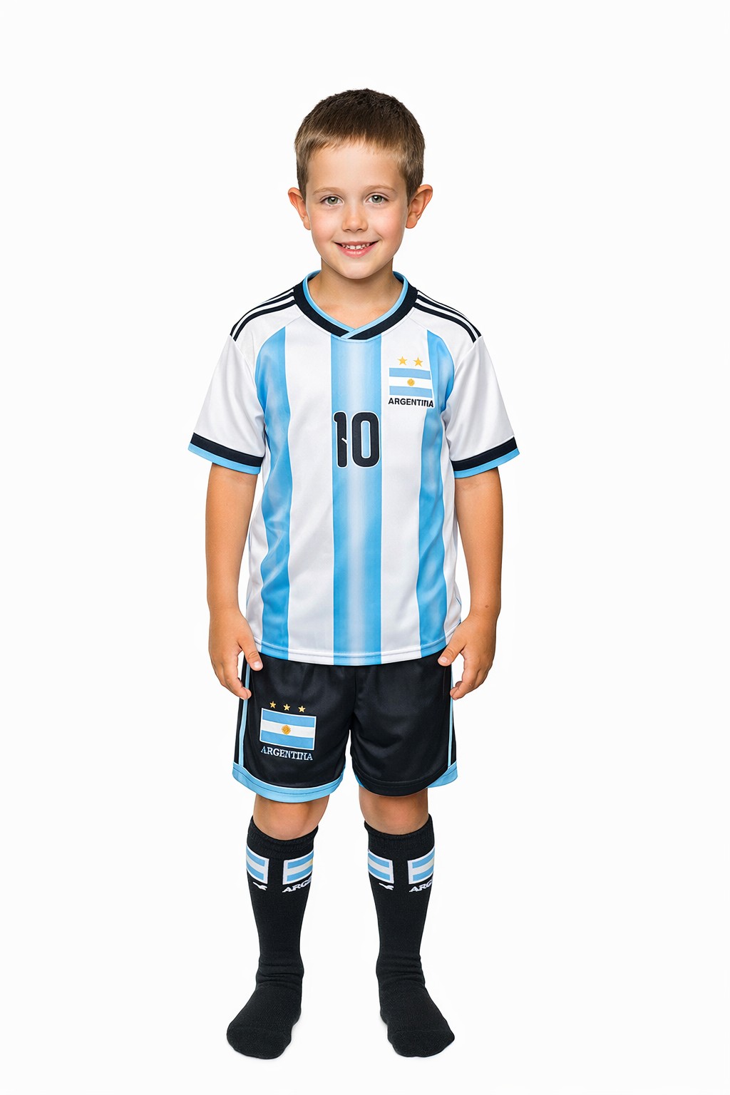 Super komplet – spodenki, koszulka oraz getry, dla małego piłkarza. Dzięki niemu, mały zawodnik bez wątpienia poczuje się jak prawdziwa gwiazda futbolu. Jeśli Twoje dziecko uczęszcza na treningi piłki nożnej, albo całymi dniami kopie piłkę na podwórku, koniecznie wyposaż go w strój piłkarski. Stanowi on nieodłączny element, niezbędny dla każdego miłośnika tego sportu. Który w przyszłości może stać się prawdziwą gwiazdą boiska – taką jak Lionel Messi. Charakterystyczny strój piłkarski Messi 10 dla dzieci z pewnością pozwoli wyróżnić się wśród innych zawodników oraz sprawi, że mały piłkarz poczuje się wyjątkowo.